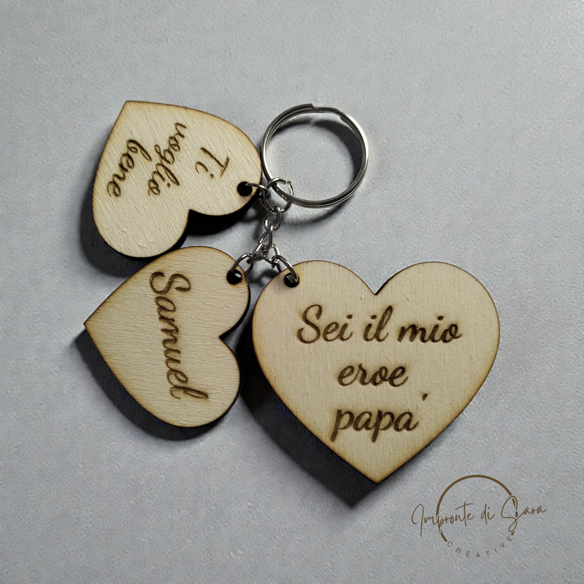 Portachiavi con tre cuoricini con incisione sopra.